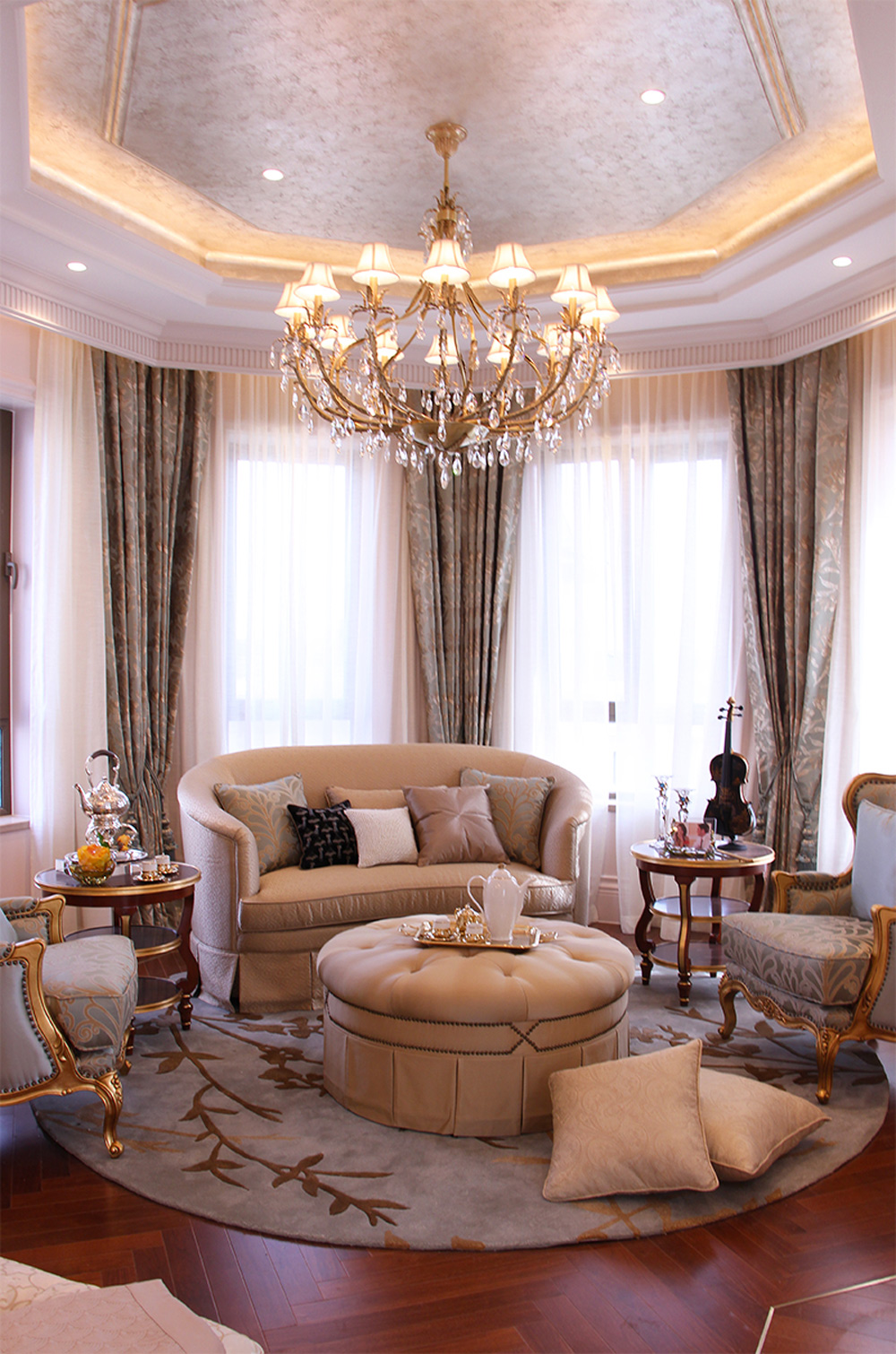 户型设计上以源于欧洲古典宫廷建筑的十字内廊作为轴组织功能空间,并进行礼仪、社交、家庭、休息四大功能的分区,形成平层官邸所特有的十字平面, 使得布局更为严谨、对称,彰显庄重礼仪感和恢弘气势。